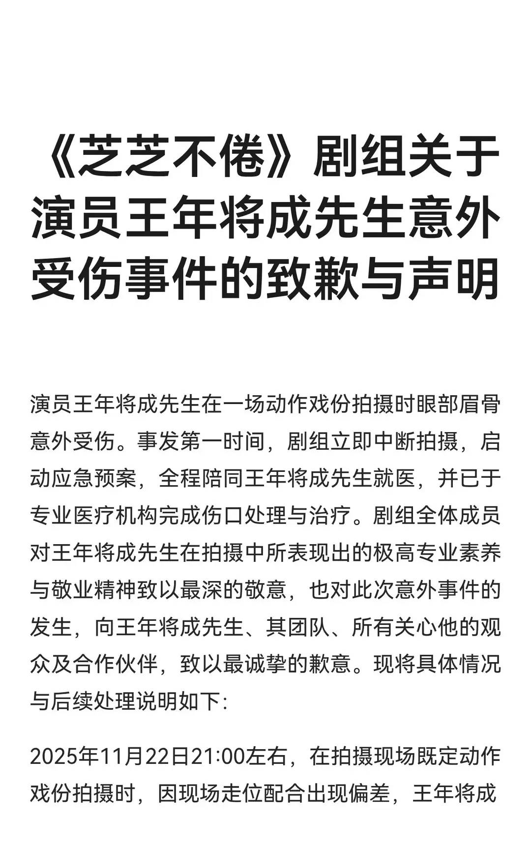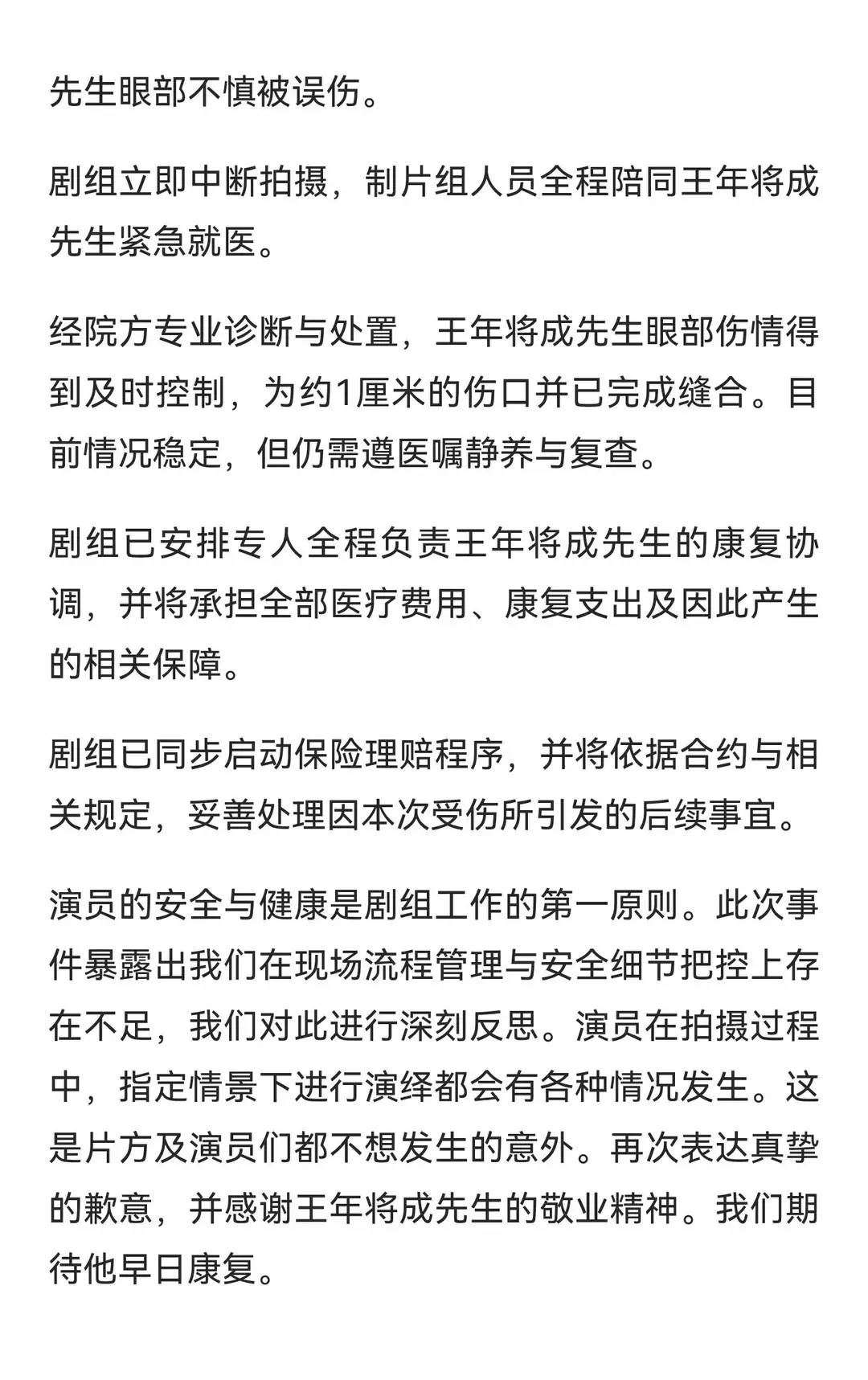 随后,剧组发致歉声明回应王年将成被打伤一事,称因走位偏差被误伤,约1厘米的伤口已完成缝合,承诺承担医疗费用及后续保障。王年将成表示伤口缝了3针,目前需要休养,剧组拍摄已经暂停。其经纪团队表示,损失很大,将追责。