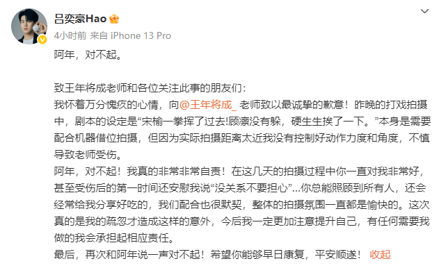 23日,打伤王年将成的对手演员吕奕豪发文道歉,称本身是需要配合机器借位拍摄,但因为实际拍摄距离太近我没有控制好动作力度和角度,不慎导致对方受伤。剧组也发布声明,表示已安排
