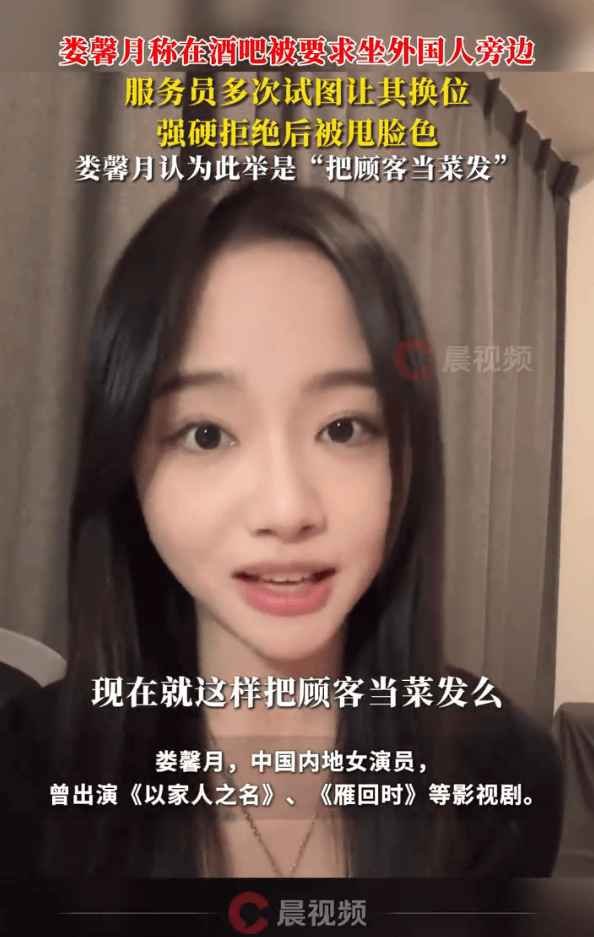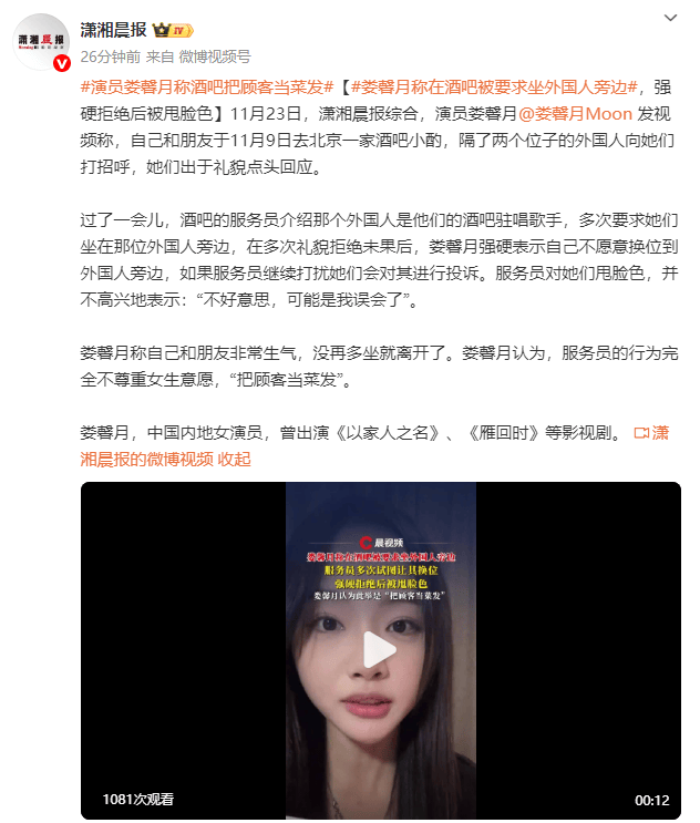 11月23日,潇湘晨报综合,演员娄馨月发视频称,自己和朋友于11月9日去北京一家酒吧小酌,隔了两个位子的外国人向她们打招呼,她们出于礼貌点头回应。