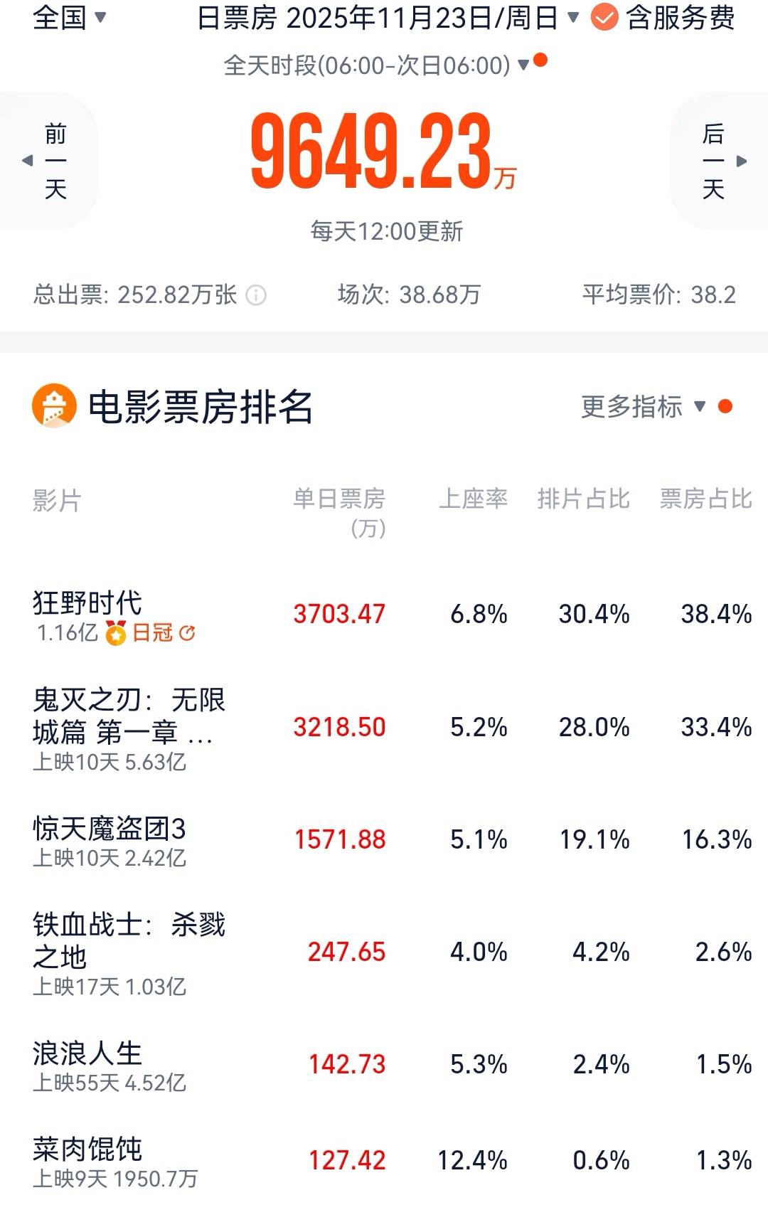 11月22日,华策电影主控出品,毕赣执导,易烊千玺、舒淇、赵又廷、李庚希、黄觉等主演的文艺片《狂野时代》上映,首日票房7948万元,上座率12.8%,次日票房快速跌到了3703万元,跌幅超53%,上座率跌到了6.8%。
