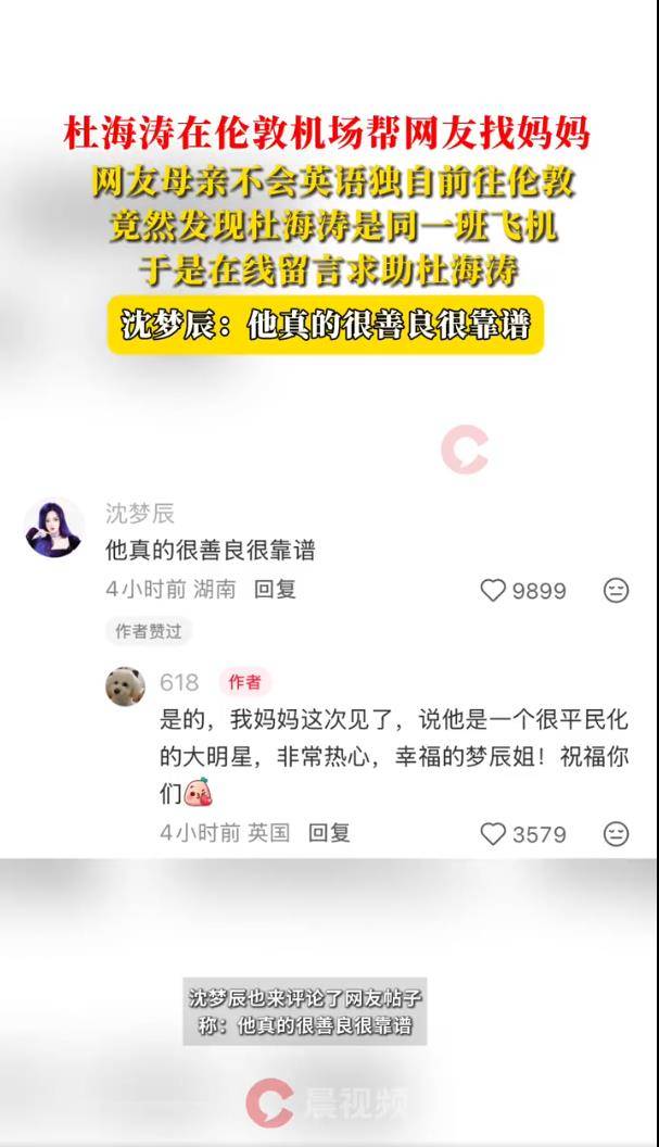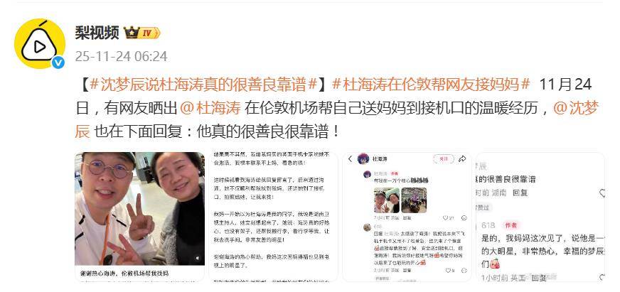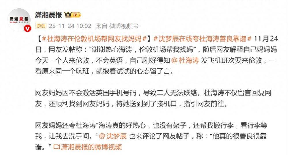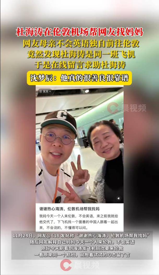 杜海涛因为一件机场小事冲上热搜,被网友狂赞“人帅心善”。原来,他竟在伦敦希思罗机场当起了“临时儿子”,帮一位陌生网友成功找到了妈妈。据11月24日报