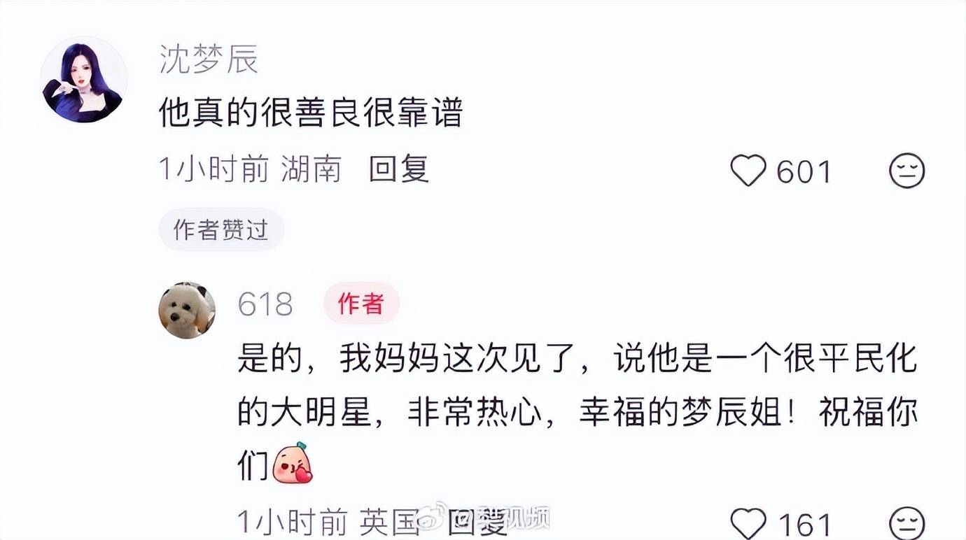 这暖心的一幕被网友详细记录并发布后,迅速引发围观。更甜的是,妻子沈梦辰也亲自下场,在帖子下评论力挺丈夫:“他真的很善良很靠谱。”这条评论获得了点赞,网友也纷纷回复,祝福二人“幸福美满”。