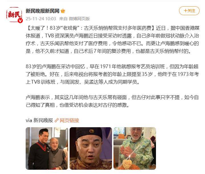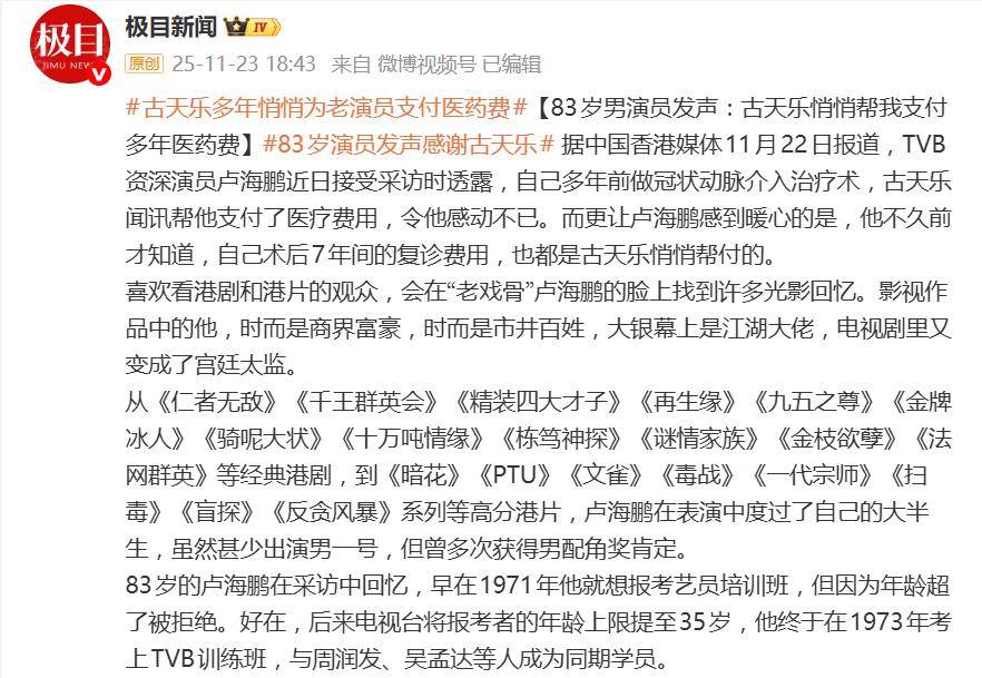 据11月24日报道,娱乐圈又悄然流传开一则暖闻——83岁的TVB资深演员卢海鹏在采访中透露,自己多年前接受心脏手术及术后七年的复诊费用,竟全由古天乐默默承担,而当事人直到最近才从第三方得知真相。