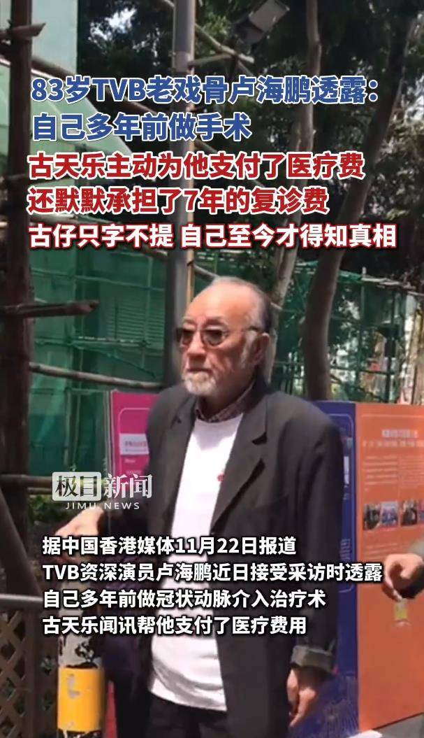 据11月24日报道,娱乐圈又悄然流传开一则暖闻——83岁的TVB资深演员卢海鹏在采访中透露,自己多年前接受心脏手术及术后七年的复诊费用,竟全由古天乐默默承担,而当事人
