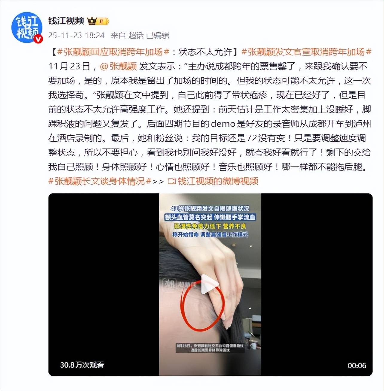 这也直接影响了她的职业决策。在成都跨年演唱会原场次门票售罄后,主办方曾提出加场请求,张靓颖本人也预留了时间。但面对身体的频频警报,她首次拒绝了加场,并同步取消了12月所有非必要行程。