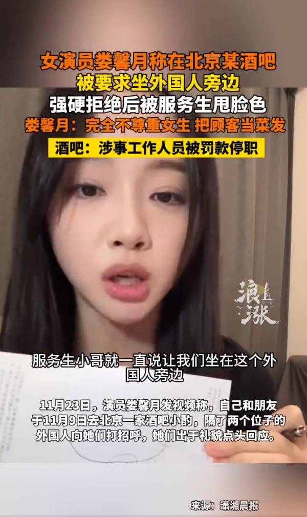 事件发生在2025年11月9日。娄馨月与朋友在北京一家网红水烟酒吧消费时,一位隔着两个座位的外国人向她们打招呼,二人出于礼貌点头回应。没想到,这一礼貌举动却引来了后续的麻烦——酒吧服务员随即上前,多次要求她们换座到那位外国人旁边,并介绍其是酒吧的驻唱歌手,将此举定义为“酒吧社交活动”。
