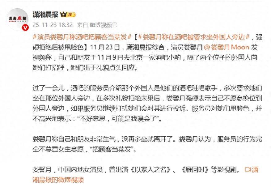 据11月24日报道,演员娄馨月曝光在北京一家酒吧的糟心经历,瞬间点燃了全网关于“服务边界”与“消费者尊严”的大讨论。一场原本轻松的小酌,竟因服务员强推换座而演变成一场风波。