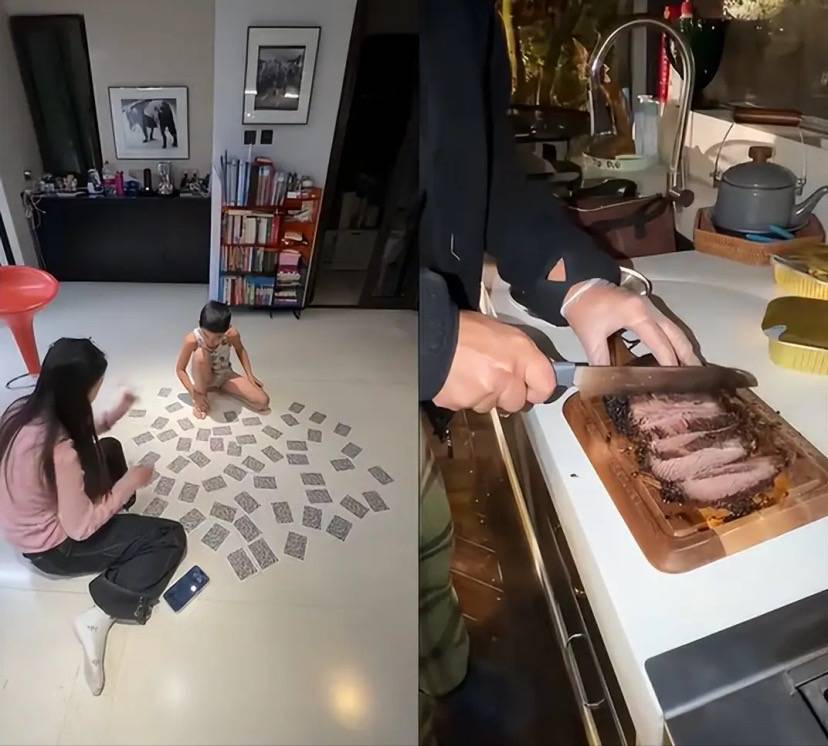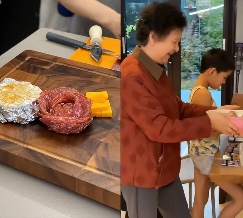 家里的菜板,也是实木的、看着就很有格调。甚至做菜用到的各种道具、以及厨具,都非常讲究。而且梅婷家里非常暖和,儿子直接穿着背心和短裤,跟奶奶一起忙碌,侧脸看着像爸爸。