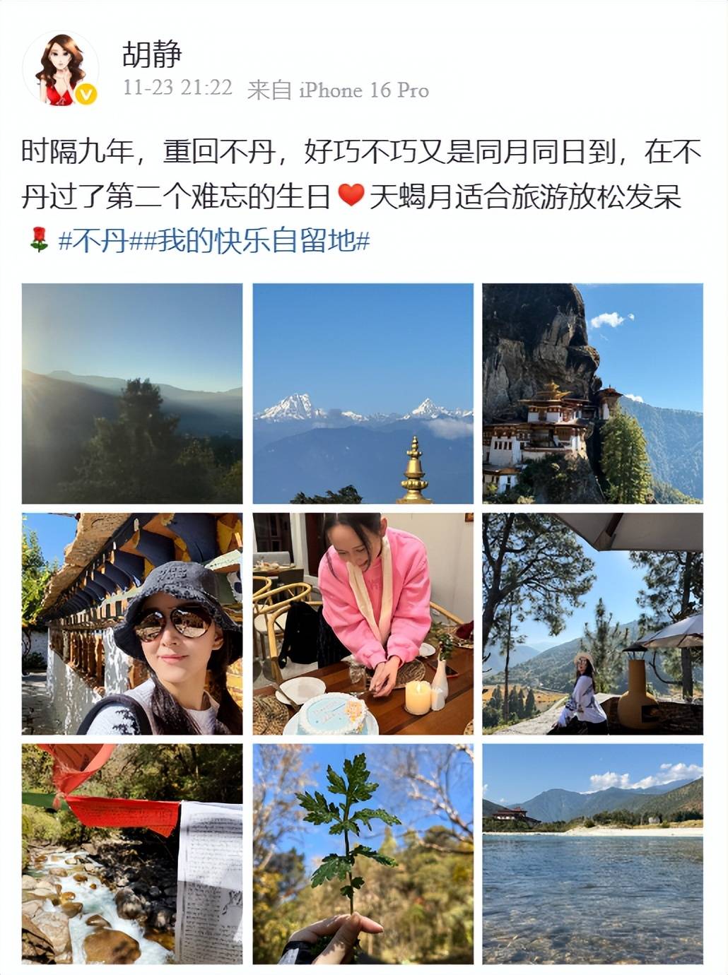 两夫妻上了综艺之后还是很低调,在胡静47岁的生日两口子来到了不丹旅游,在11月23日,胡静在自己的社交平台上晒出了美照,还配文:时隔九年,重回不丹,好巧不巧又是同月同日到,所以在不丹过了第二个难忘的生日。