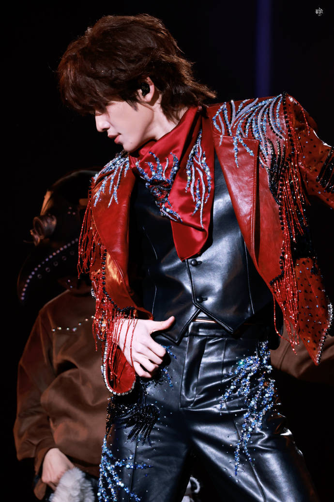 先说这舞台的魅惑感,那可太有讲究了。造型上,西部牛仔元素和暗黑美学混搭得恰到好处,红皮衣配蕾丝内搭,再加上羊角帽和半遮面纱,光是看着就很有视觉冲击力。特别是那腰臀律动的设计,还有敞胸细节配合扭腰甩纱的动作,粉丝们都说是“媚骨天成”。更绝的是,表演时帽子意外掉了,仰拍镜头下,宋亚轩那3D建模脸加上红纱飘落,瞬间被赞成了“天神即兴艺术”,这意外反倒成了舞台的高光时刻。表情和声线更是绝了,红纱掩映下,他那凌厉的凝视、吐舌舔唇的小细节,让观众觉得“肾上腺素飙升”;而他那纯情的面容配上蛊惑的声线,反差感直接拉满,低音炮喉结特写和高音转换之间,张力十足。