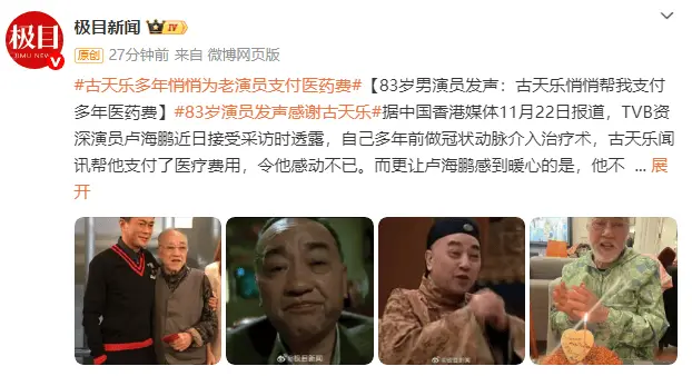 据中国香港媒体11月22日报道,83岁TVB资深戏骨卢海鹏近日在采访中披露暖心往事:多年前他接受冠状动脉介入治疗时,古天乐闻讯后主动为其支付医疗费用;更让他动容的是,直到近期他才知晓,术后7年间的所有复诊费用,均由古天乐悄悄垫付。