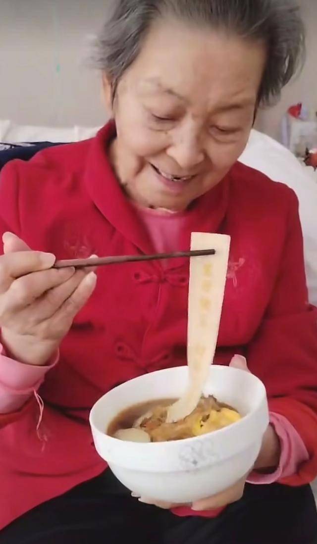 男子大声跟她说“生日快乐哈”,然后让她吃一口面。她照做了,但动作非常缓慢,让人看了很是感慨。时光啊,你慢点,你再慢点!