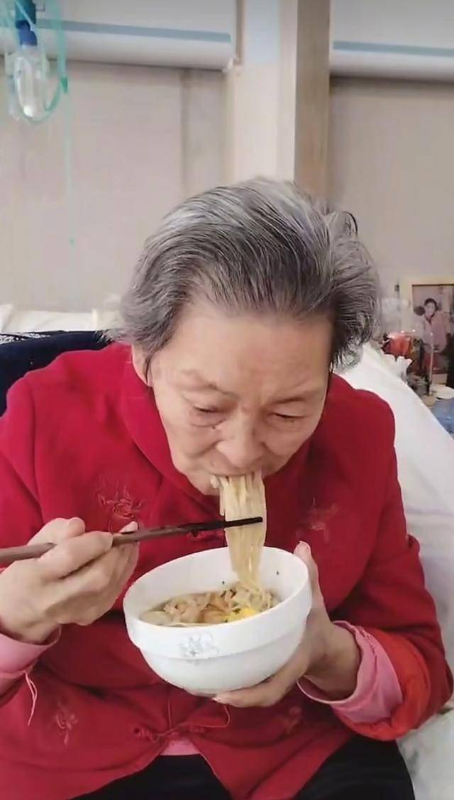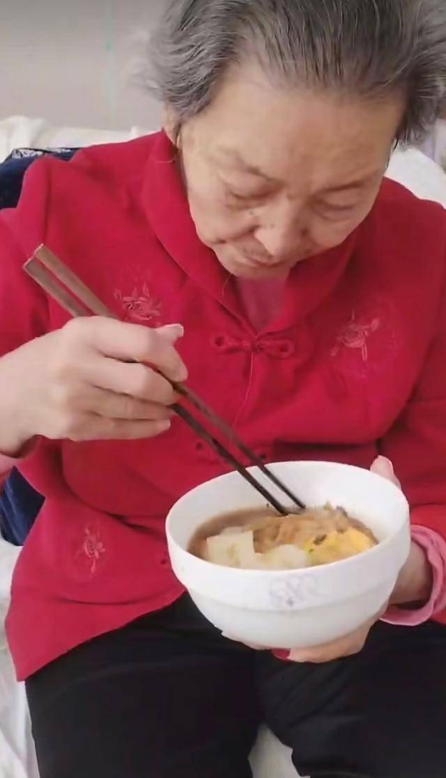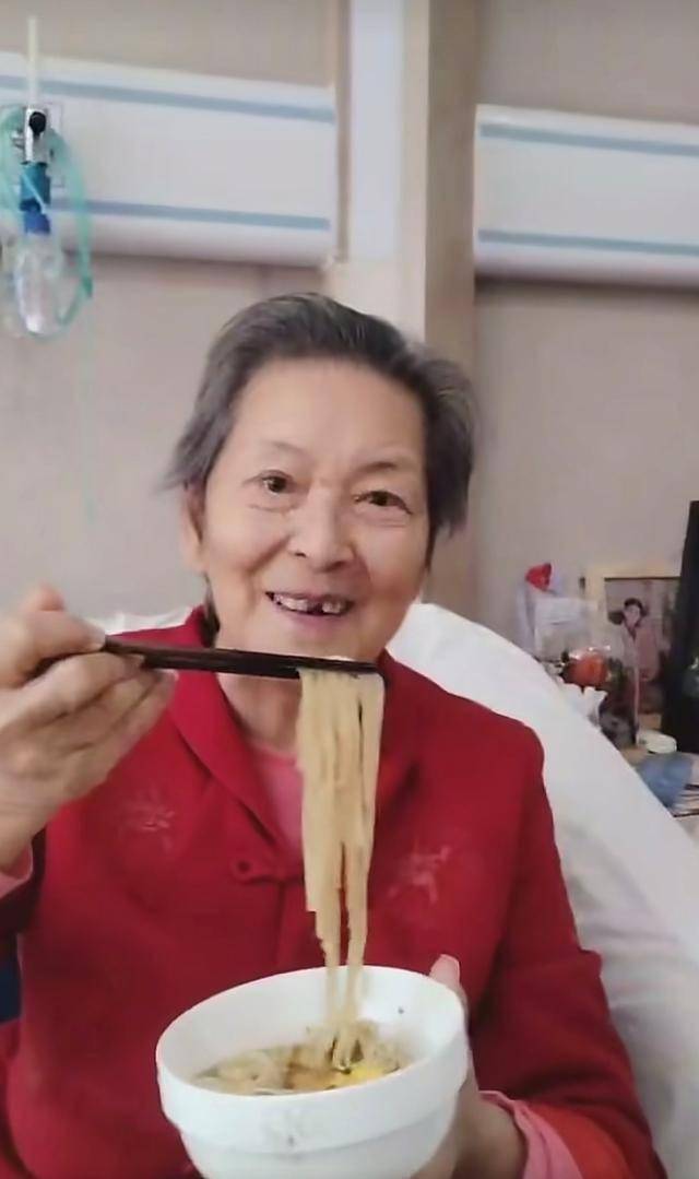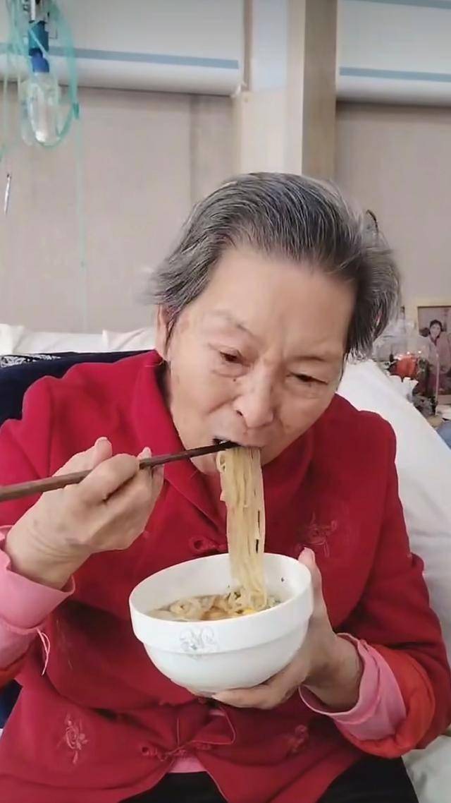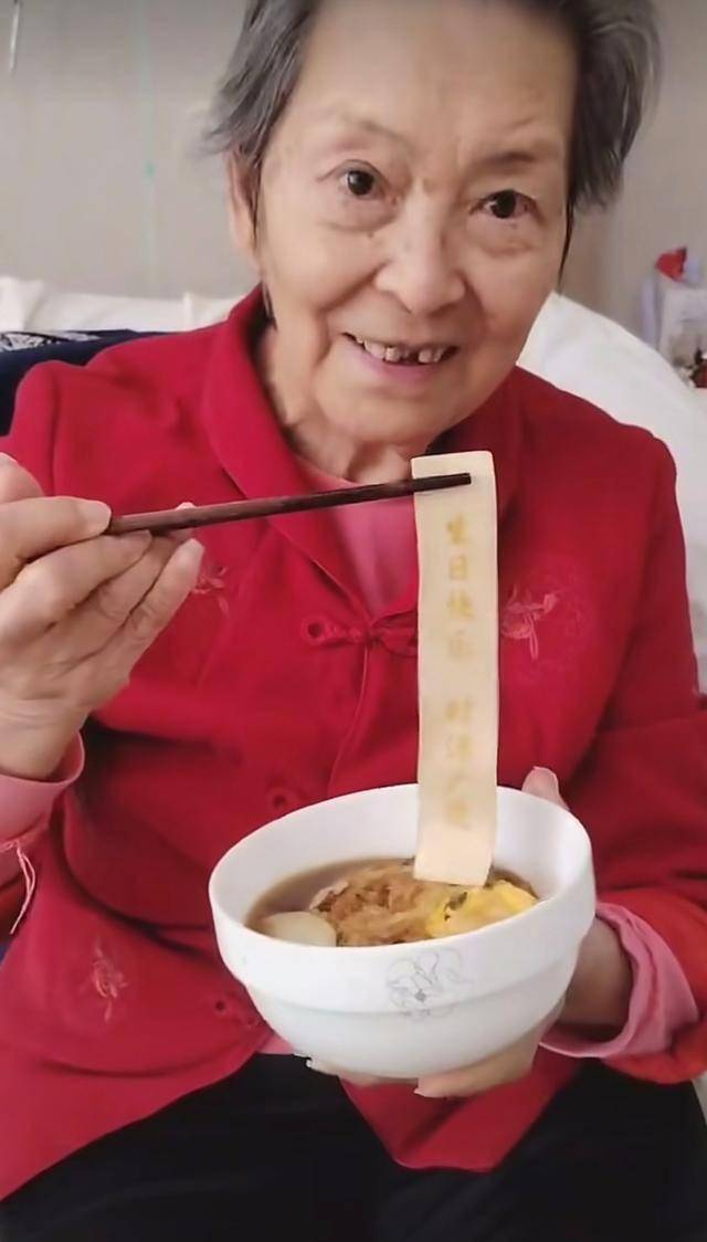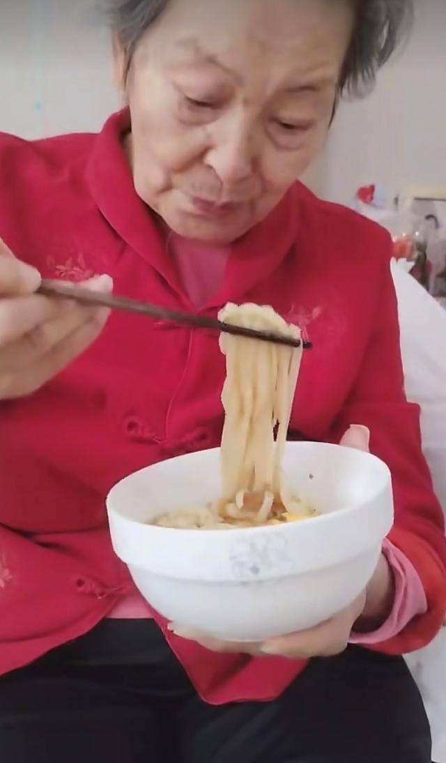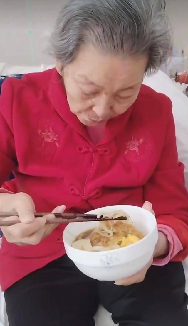 她在吃着面,男子在一旁说“吃完了93岁,进入94岁,健康长寿”。她点了点头,眼眶似乎有些微红。