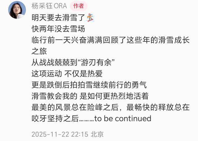 比如演员杨采钰,已经按捺不住激动的心情,提前在社交账号官宣明天(11月23日)要去滑雪的消息。