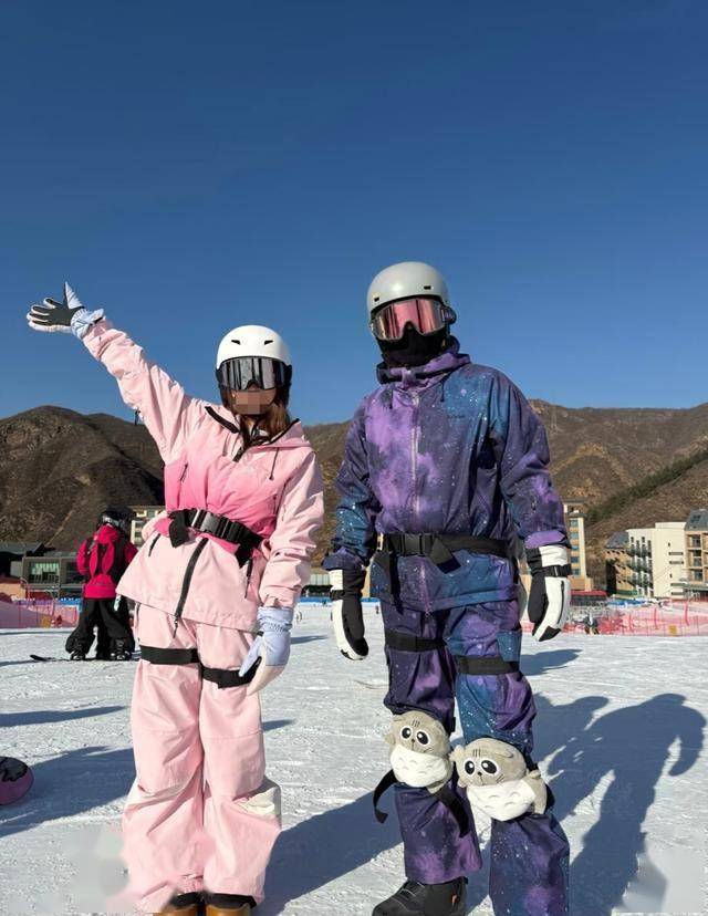 之后,夫妻俩一起从商店里走出来,又被眼尖的网友发现了。网友镜头下的他换上了紫色的滑雪服,脸上洋溢着开心的表情。