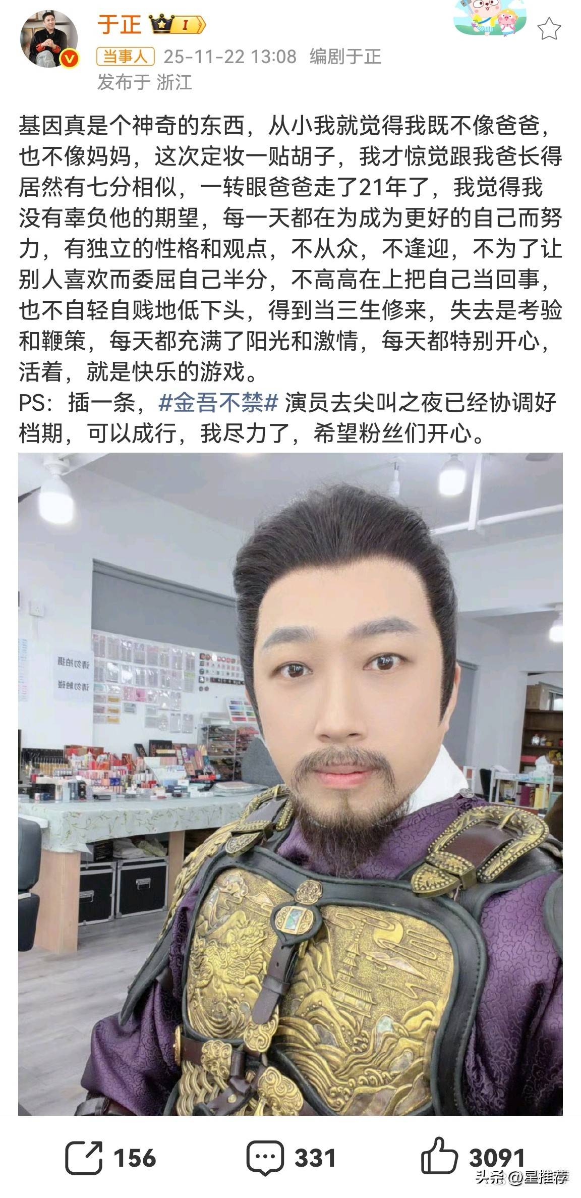 11月22日,于正在社交媒体上分享了自己在《金吾不禁》中的将军造型,并透露了一个重要消息:他已成功协调了演员赵晴和周柯宇的档期,使他们能够参加即将于12月6日在澳门举行的爱奇