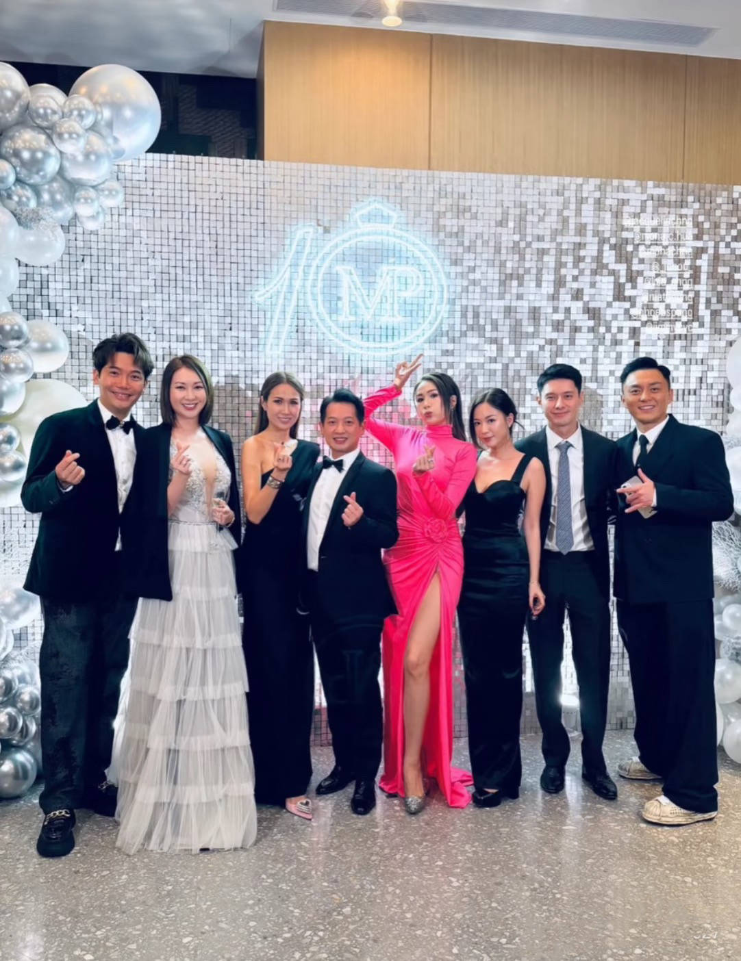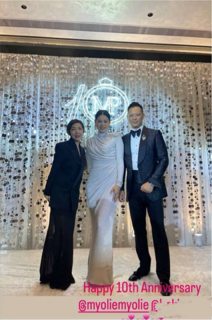 庄思敏个子高、打扮也出彩,在合影里非常醒目。从背景来看,这场10周年婚宴在一个很豪华的酒店举办,还特意布置了一番。