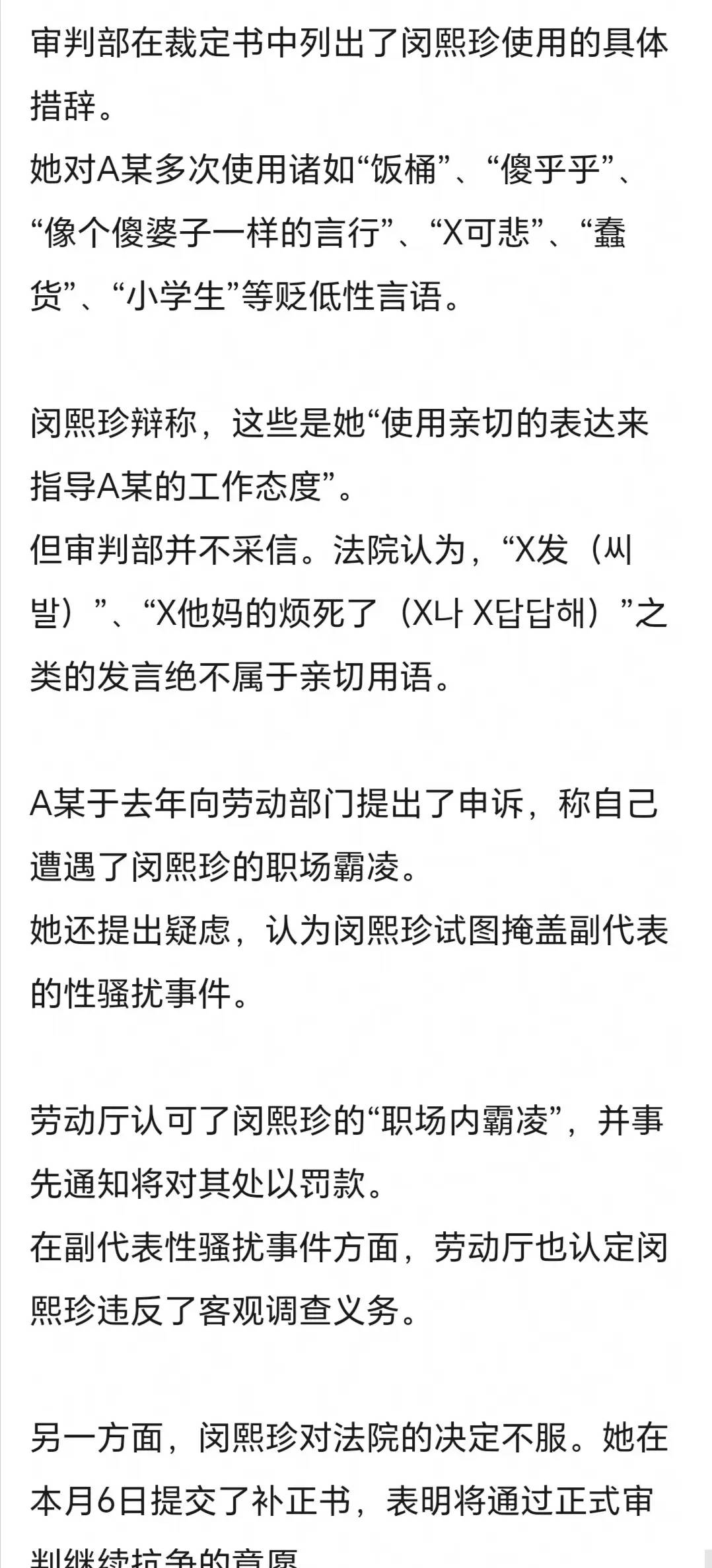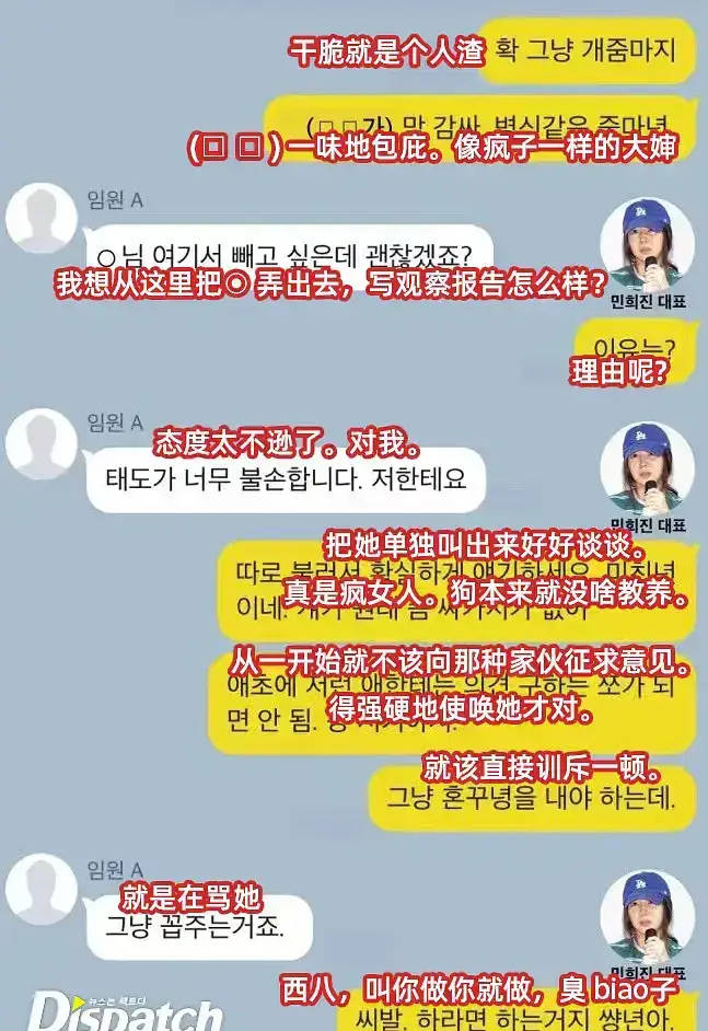 24日,D社曝光了闵熙珍职场霸凌案的判决书。判决书中写到闵熙珍在群聊中反复使用嘲讽性语言,如“饭桶”、“傻子”、”说话没脑子”、“蠢货”等,闵熙珍则辩解称这是“为了指导A某得工作态度,而使用的亲切表达”,但法院并未采纳这一说法。