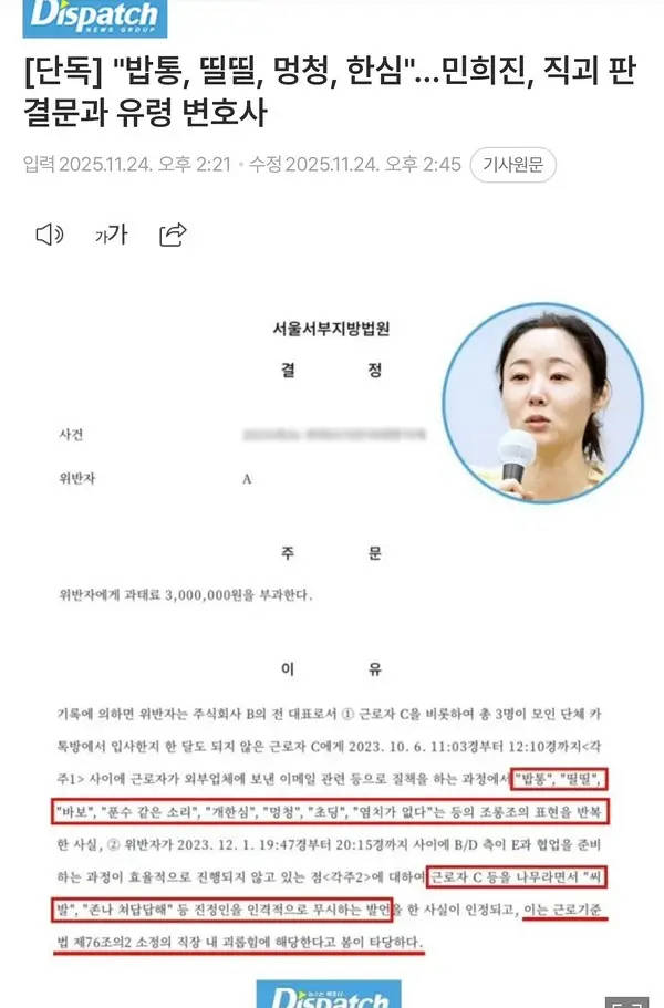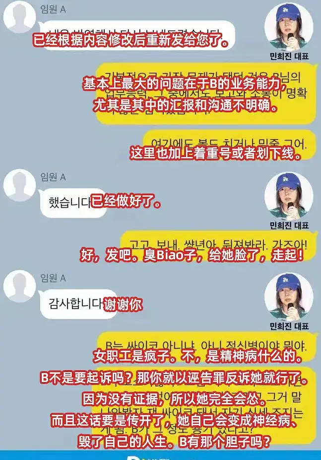 24日,D社曝光了闵熙珍职场霸凌案的判决书。判决书中写到闵熙珍在群聊中反复使用嘲讽性语言,如“饭桶”、“傻子”、”说话没脑子”、“