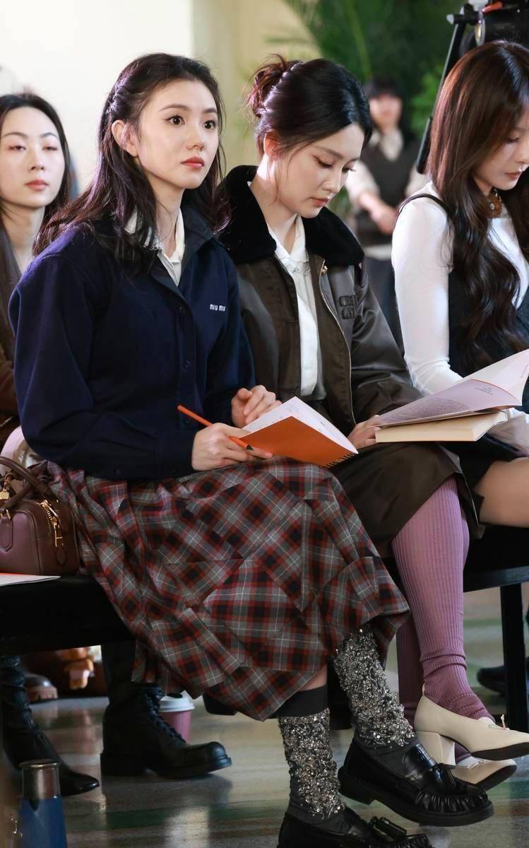 就在大家对着穿搭品头论足时,李沁一亮相直接把镜头都吸走了。她穿黑白拼接的 MiuMiu连衣裙,外面搭件薄薄的开衫,乍一看低调得很,可视线一往下移 —— 好家伙,那双紫色长袜简直是 "时尚核武器"!