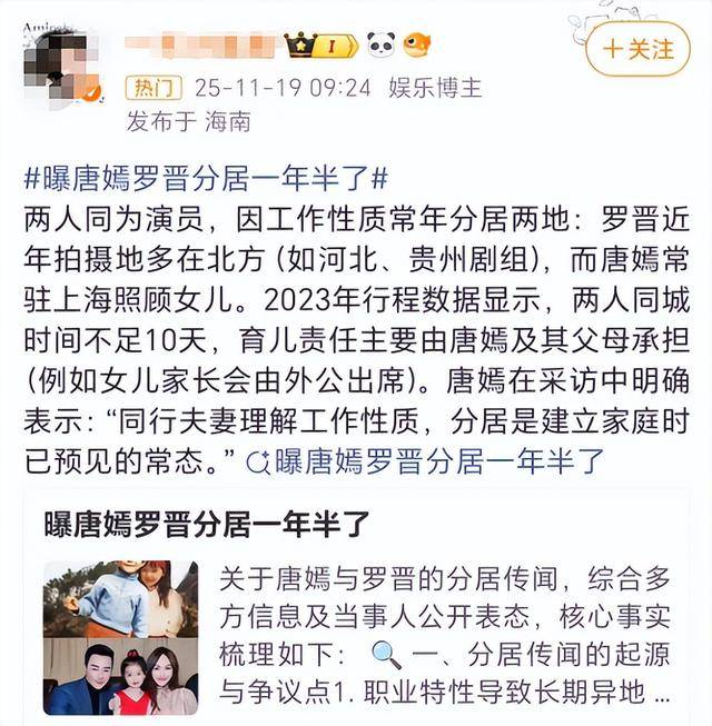 这些消息的热度一上来,吃瓜网友们扒得更细了,发现2023年唐嫣罗晋同框在一个城市的时间不到 10 天,2024年到现在微博上零互动,于是不少人认为:这不正好对上 “分居” 的说法?