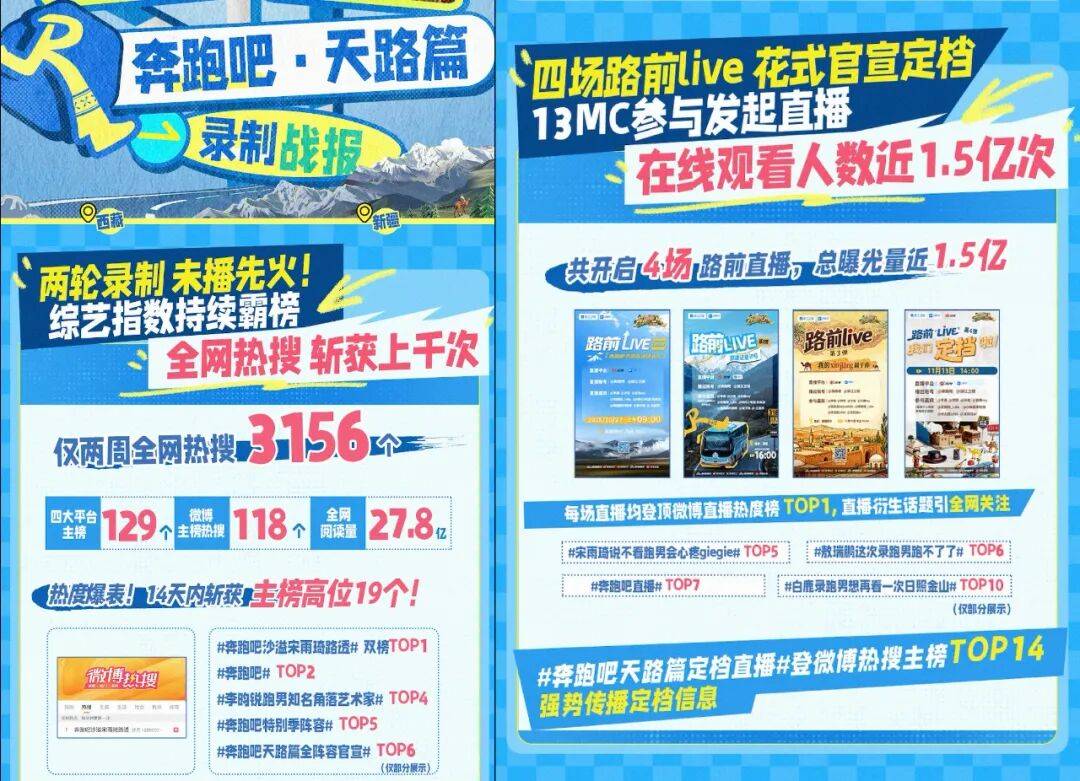 观众的真实反响证明《天路篇》走对了路,节目两周斩获全网热搜3156个、微博主榜高位热搜19个,四场路前live预热直播在线人数近1.5亿次,足见《奔跑吧》系列仍是聚拢全民注意力的话题宠儿。