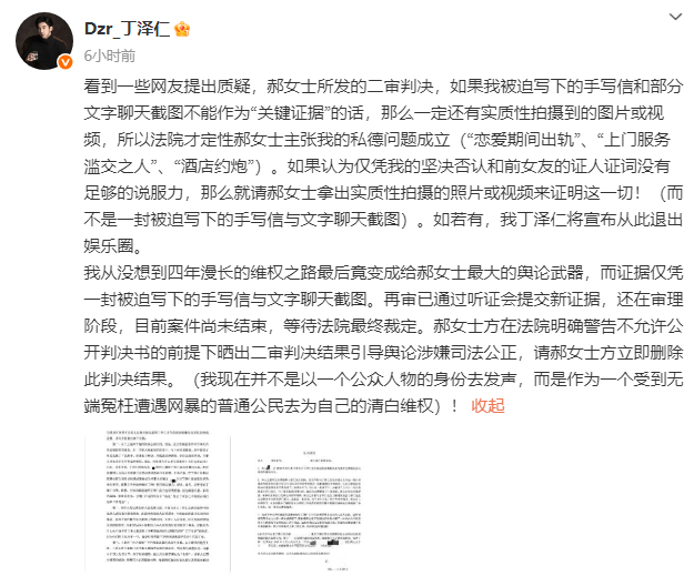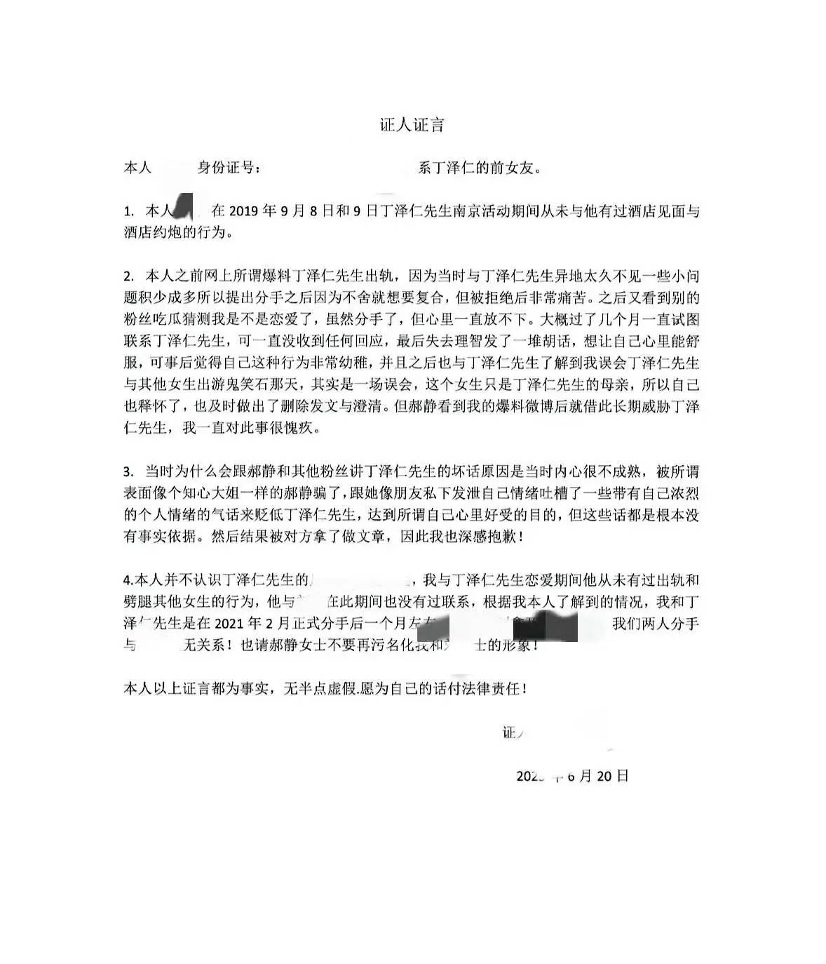 丁泽仁表示:“如果认为仅凭我的坚决否认和前女友的证人证词没有足够的说服力,那么就请郝女士拿出实质性拍摄的照片或视频来证明这一切!(而不是一封被迫写下的手写信与文字聊天截图)。如若有,我丁泽仁将宣布从此退出娱乐圈。”