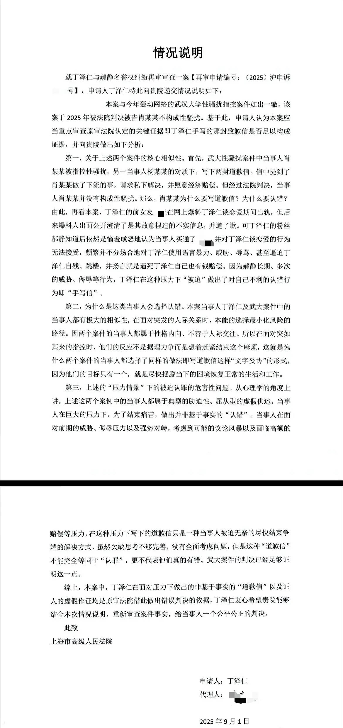 24日,丁泽仁发文喊话“唯一的姐”删除判决结果,他发文称:“郝女士方在法院明确警告不允许公开判决书的前提下晒出二审判决结果引导舆论涉嫌司法公正,请郝女士方立即删除此判决结果。”