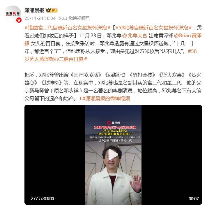据11月24日报道,香港艺人邓兆尊在出席好友黄泽锋女儿的百日宴时,轻描淡写抛出一枚“深水炸弹”——自称从业十几二十年来,遭遇近百名女星主动投怀送抱,却一个都没接受,理由竟是“见过对方卸妆后认不出人”。此言一出,瞬间点燃舆论,网友直呼:“这是把娱乐圈潜规则当段子讲了?”