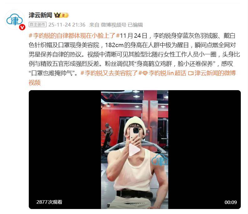 11月24日,李昀锐现身美容院的画面又一次引爆了热搜。视频里,他身着蓝灰色羽绒服,头戴白色针织帽和口罩,182cm的挺拔身高在人群中“鹤立鸡群”。然而最让网友惊叹的,是口罩遮掩下那张异常小巧的脸——现场清晰可见,他的脸型比同行的女性工作人员还要小上一圈,头身比例与精致五官形成的强烈反差,被粉丝调侃为“身高鹤立鸡群,脸小还卷保养”。