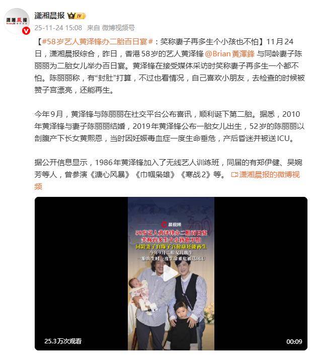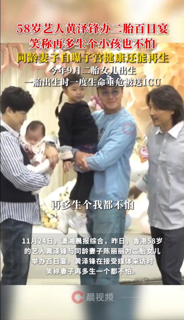 据11月24日报道,58岁的香港艺人黄泽锋与同龄妻子陈丽丽为二胎女儿“小贵妃”高调举办百日宴,现场设宴40桌,以粉色糖果玩具为主题,圈内好友胡枫、黄浩然等人到场祝贺。宴会上,黄泽锋调侃“妻子再多生一个也不怕”,而陈丽丽虽表示“封肚”,却也不忘补充“看情况”,并透露体检时被医生称赞“子宫漂亮,还能再生”,引发热议。