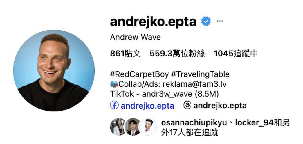近日,陈桢怡还惊喜现身全球坐拥 559.3 万粉丝的网红 “andrejko.epta”(Andrew Wave)的社交网!