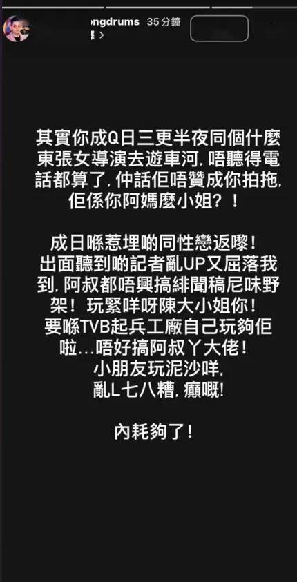又指“大叔我都不兴搞绯闻这套!玩什么呀陈大姐你!要在TVB建兵工厂你自己玩个够好啦……别搞大叔我啊大哥!小朋友玩泥沙吗,乱七八糟,疯的!内耗够了!”帖文在网络疯传,有网民爆料陈晓彤有吸食大麻的习惯。