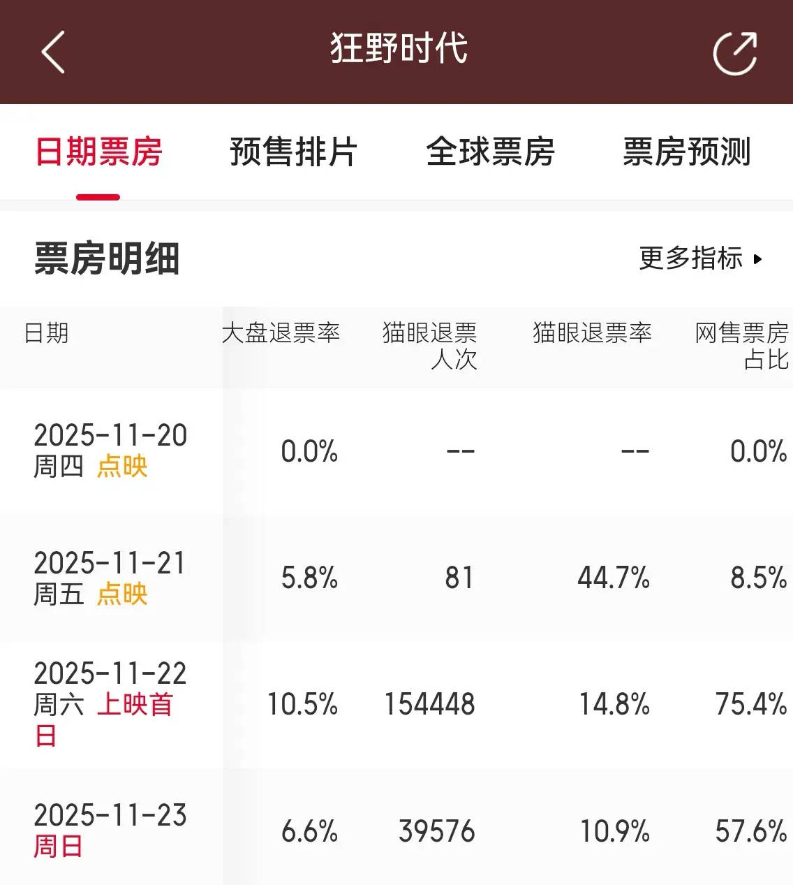 值得关注的是,该影片上市首日的退票率在个别平台上已接近15%。据猫眼专业版,《狂野时代》上映首日(即11月22日),大盘退票人次达25.6万,大盘退票率达10.5%;猫眼退票人次达15.4万,猫眼退票率达14.8%。退票率和同期部分热门影片相比,略偏高。此外,11月22日、23日该影片的网售票房占比分别为75.4%、57.6%,较同期热门影片偏低。