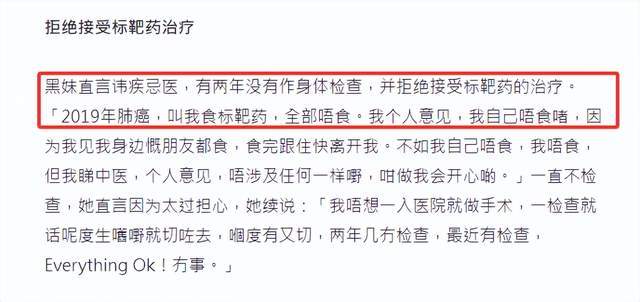 好在结果是好的,经历了长时间的大手术,李丽霞的病情算是控制住了。不过她在接受采访的时候表示,自己讳疾忌医,前前后后差不多有两年的时间没有做检查,也没有所谓的靶向治疗。