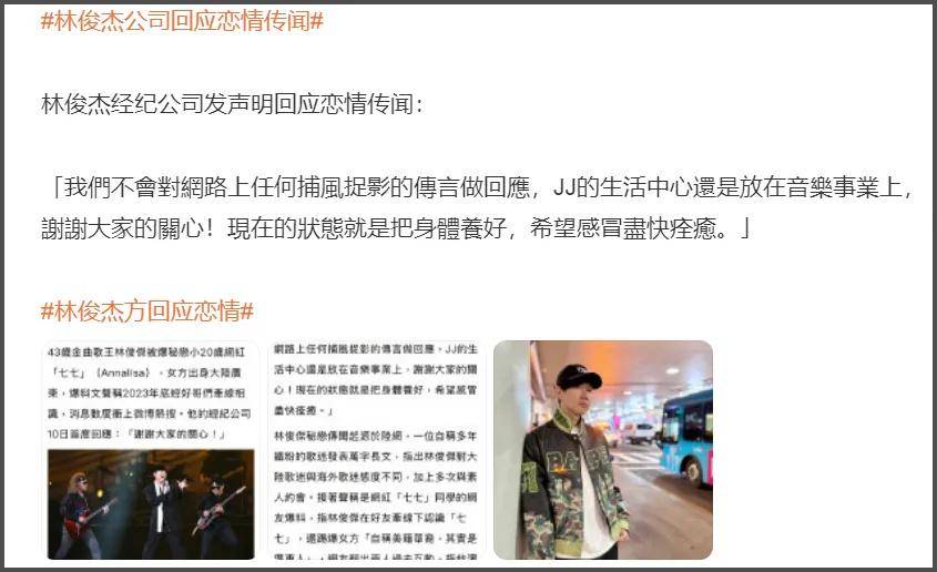 针对这段传闻,年初的时候林俊杰经纪公司回应了,他们表示不会对任何捕风捉影的传言回应,强调林俊杰的生活重心还是放在音乐事业上,当下的状态是把身体养好,感谢大家的关心。整个回应相当于啥也没说,既没有辟谣恋情也没有承认恋情,把女方架在火上烤,放任粉丝对她的攻击,最后还不忘“卖惨”博得粉丝的怜爱。