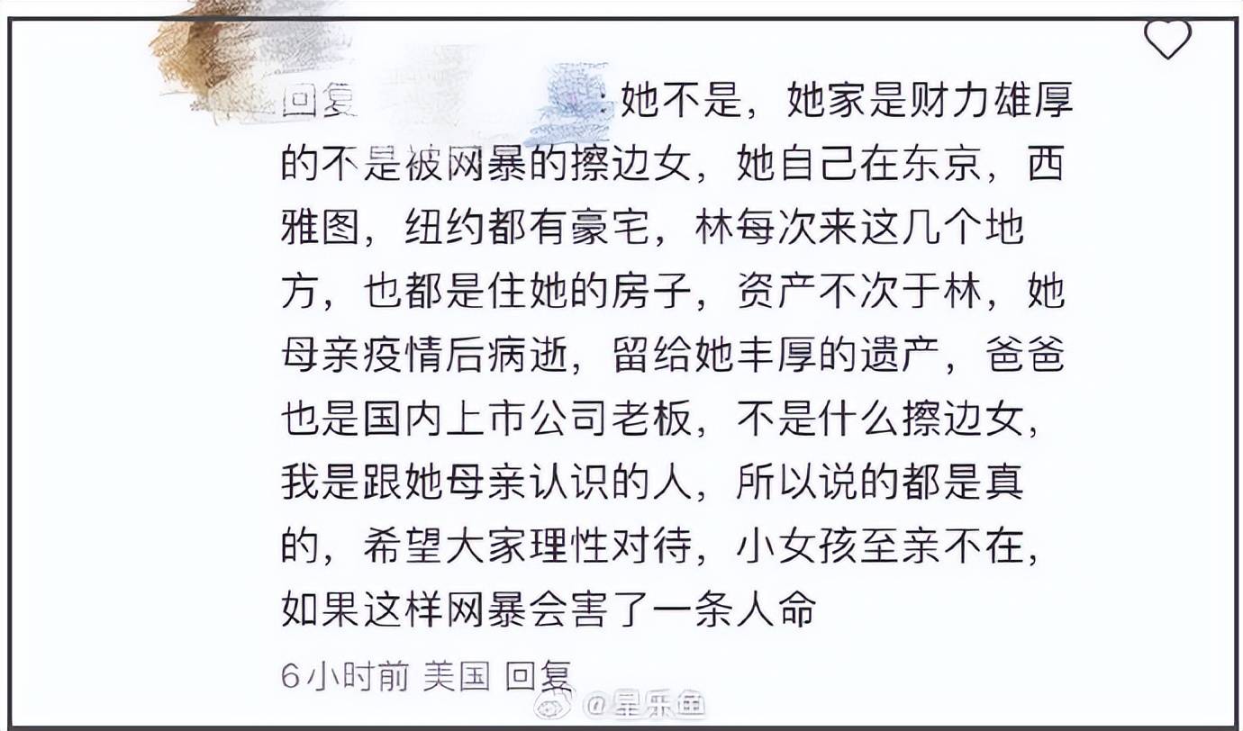 随后,女方这边的知情人爆料称女方家庭财力雄厚,在东京、纽约、西雅图等都有豪宅,林俊杰每次到这几个地方都是住在女方家。而且,她个人资产也不输林俊杰,继承了去世母亲的大量遗产,父亲也是上市公司老板,劝诫粉丝不要网暴无辜人。