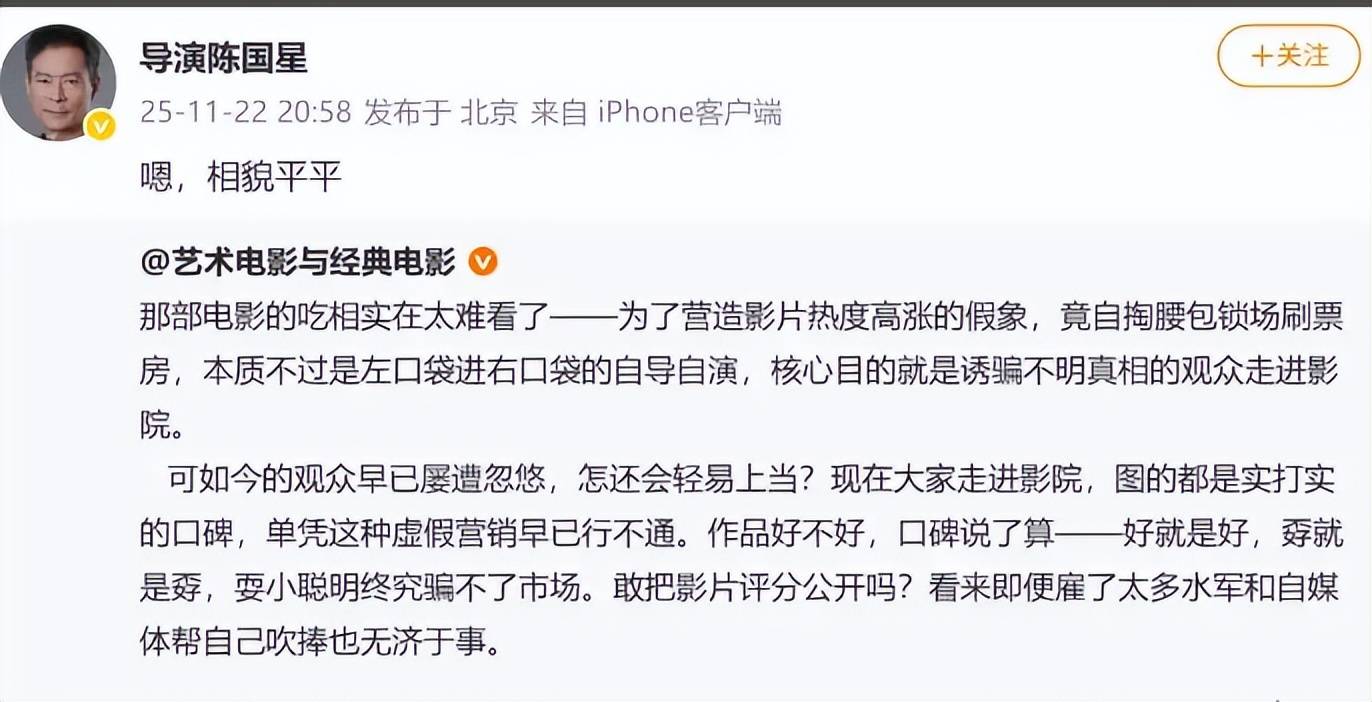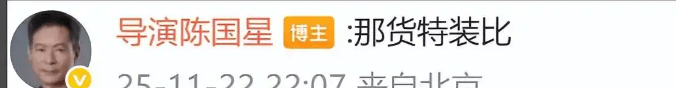 之后,导演陈国星转发了这条动态,并且配文内涵称“相貌平平”,还在评论区直言“那货特装”。
