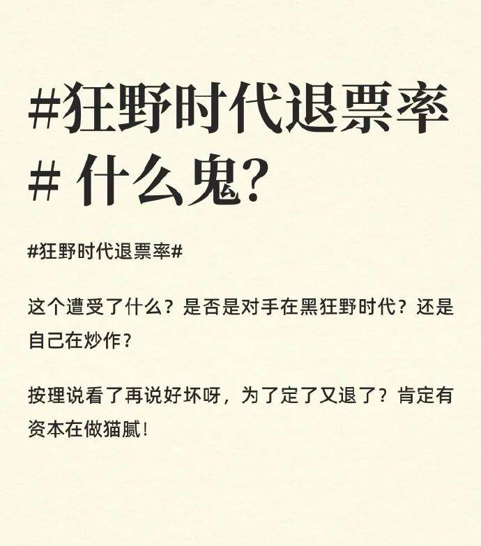 多方平台监测《狂野时代》首日退票率达14.6%-15%(约15.5万人次),相当于每7张票有1张退回,远超商业片4.8%的常态值。