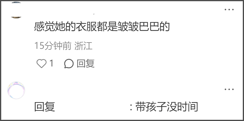 网友看完都很佩服她,一个人带两个孩子,真是厉害,也怪不得她的状态这么疲惫,穿搭也不在意细节了,毕竟又要照顾生病的家人,还要带两个孩子,估计都没有啥打扮化妆的时间和心思。