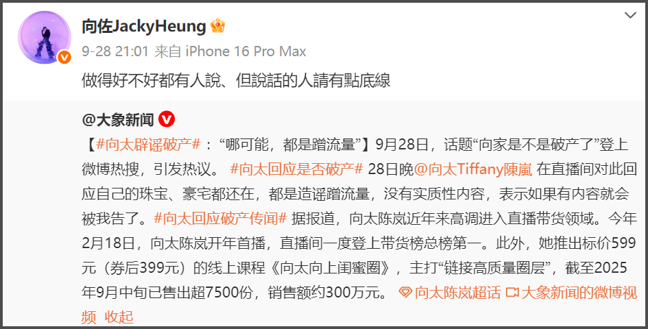 此前向佐否认向家破产传闻,但近几年包括向太在内,向家人几乎全员出动出来工作,看上去有些着急挣钱的感觉,也难免会引起网友怀疑。