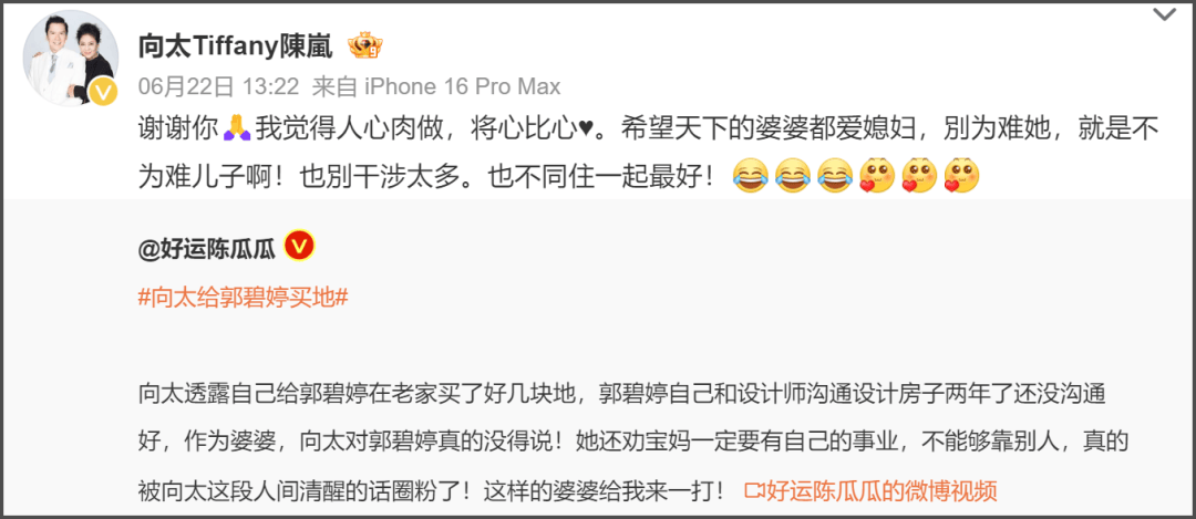 也有网友表示,郭碧婷作为豪门儿媳也得到不少好处,比如向太给郭碧婷在老家买了好几块地盖房子,还发文大谈“婆媳经”,称“希望天下的婆婆都爱媳妇,别为难她,就是不为难儿子”。