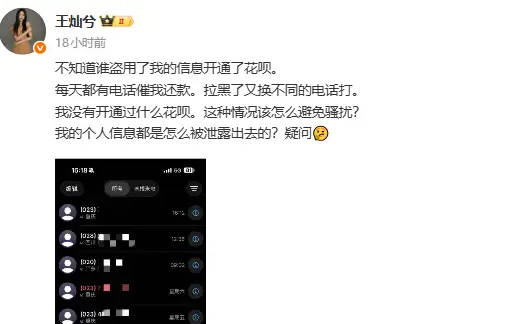 11月25日,杜淳老婆王灿兮发文称被人盗用了信息开通了花呗,“每天都有电话催我还款。拉黑了又换不同的电话打。我没有开通过什么花呗。这种情况该怎么避免骚扰?我的个人