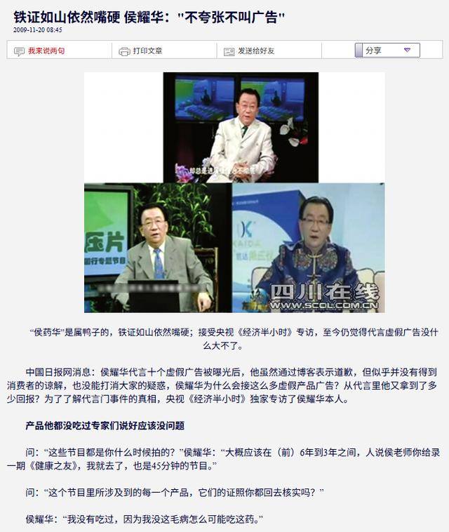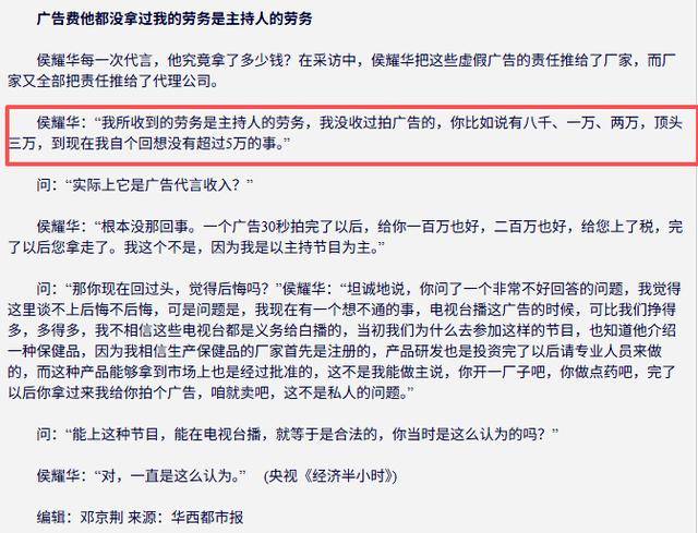 事发后,侯耀华发布了道歉信,并称自己没有代言相关产品,而是广告方通过剪辑他的主持片段,给他安上了“代言人”名号。
