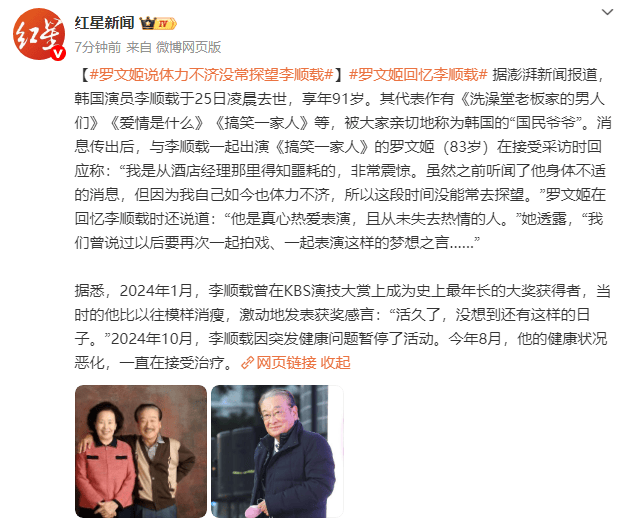 据悉,2024年1月,李顺载曾在KBS演技大赏上成为史上最年长的大奖获得者,当时的他比以往模样消瘦,激动地发表获奖感言:“活久了,没想到还有这样的日子。”2024年10月,李顺载因突发健康问题暂停了活动。今年8月,他的健康状况恶化,一直在接受治疗。