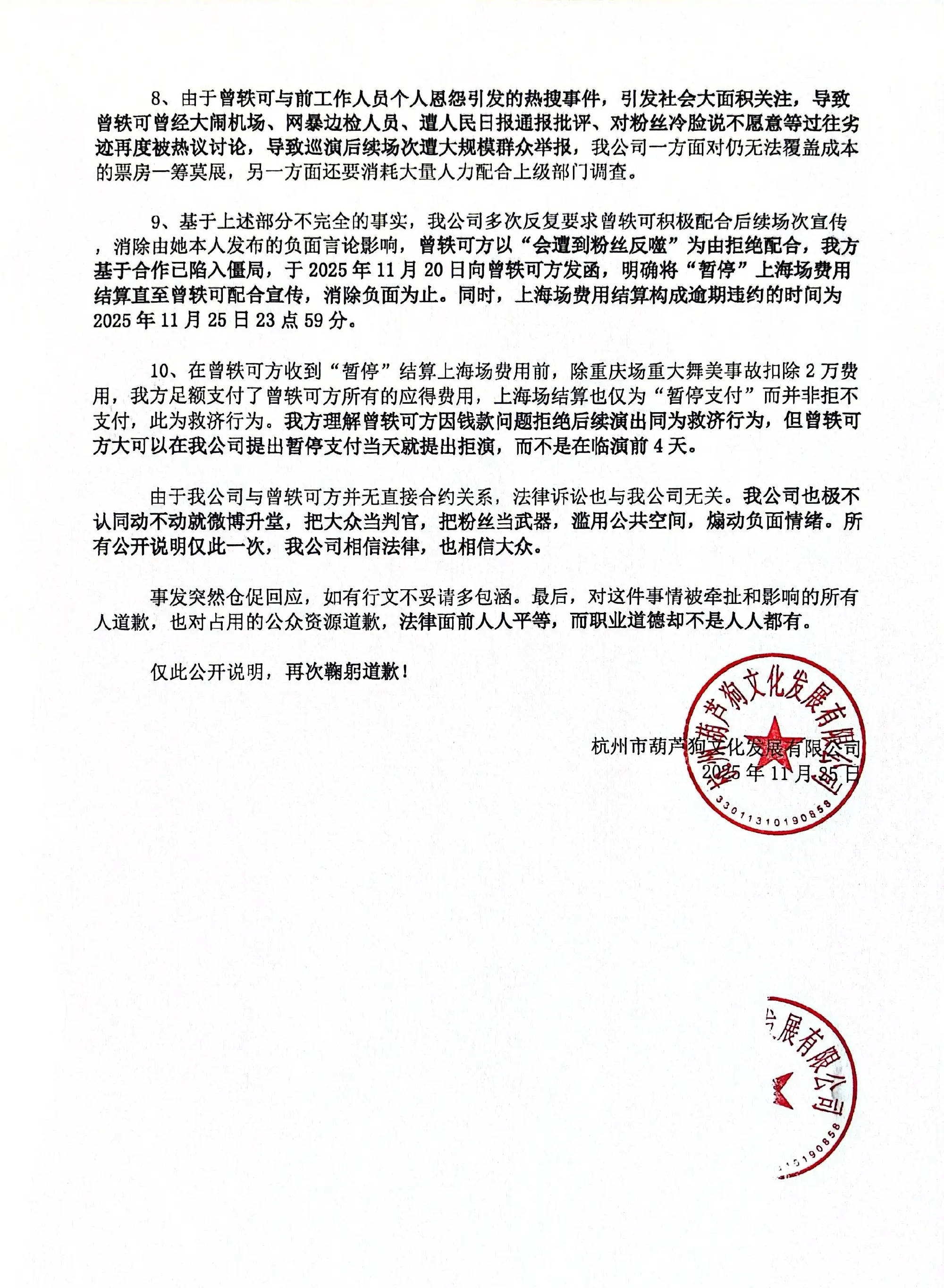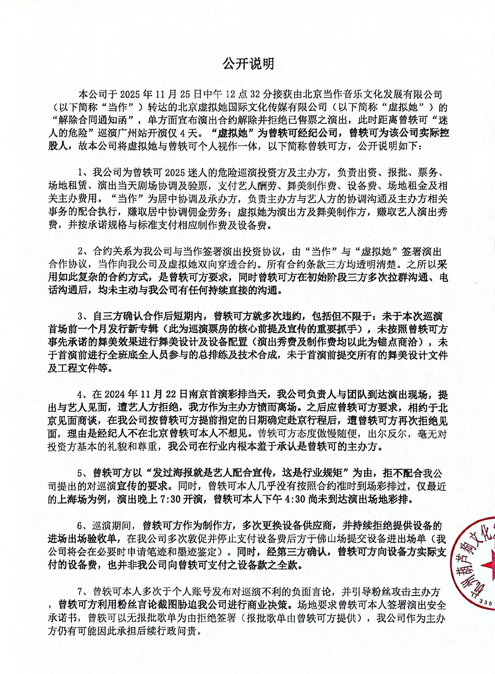 25日,曾轶可工作室发声明回应网传争议后,“曾轶可迷人的危险巡演”方再发声明称,确认合作后曾轶可方多次违约,拒绝与巡演方工作人员见面,不配合对巡演公司提出的宣传要求;且曾轶可方利用粉丝言论截图威胁巡演公司进行商业决策。并称公司与曾轶可方无直接合约关系,“法律诉讼也与我公司无关。”