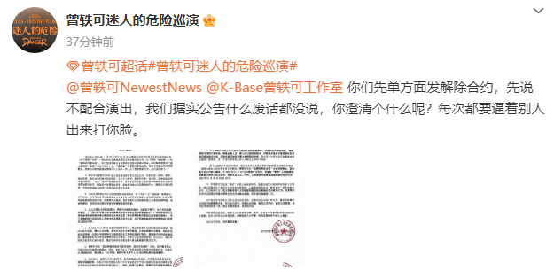 25日,曾轶可工作室发声明回应网传争议后,“曾轶可迷人的危险巡演”方再发声明称,确认合作后曾轶可方多次违约,拒绝与巡演方工作人员见面,不配合对巡演公司提出的宣传