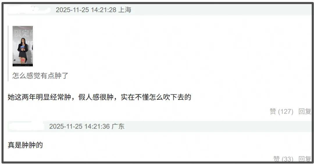 从侧面看,迪丽热巴的脸肿更是完全暴露。饱满的脸颊让她脸上的骨感美瞬间消失,侧脸看不出丝毫下颌线的痕迹,只能看见略显松弛的肉和更加突出的肿。