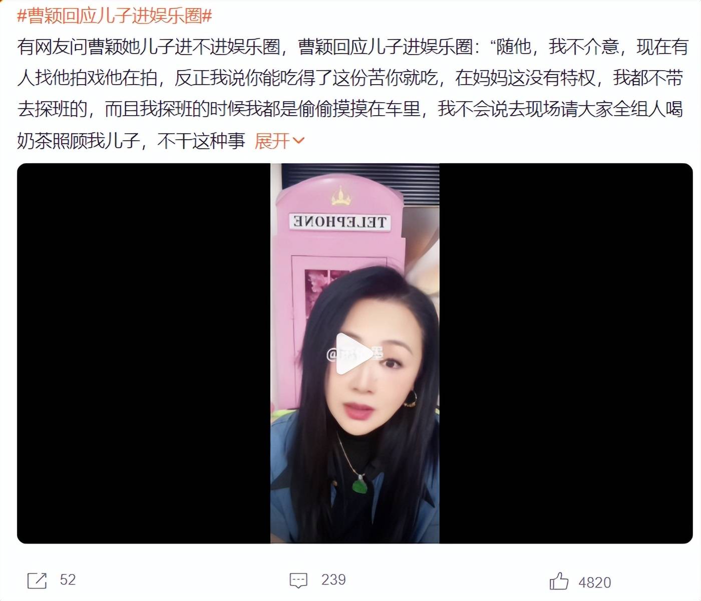 前不久,曹颖在直播的时候,被网友询问:王子涵会不会进娱乐圈,曹颖表示:随他,我不介意,现在有人找他拍戏,他正在拍摄,反正我说你能吃得了这份苦你就吃。