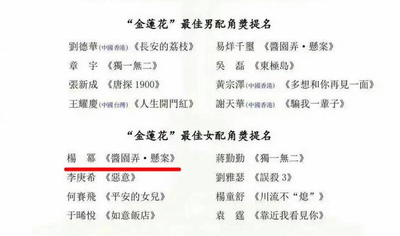 前不久,“金鸡奖”颁奖典礼落下帷幕,让大家没想到的是,“金莲花奖”公布提名名单。章子怡凭借《酱园弄·悬案》提名“最佳女主角”,杨幂
